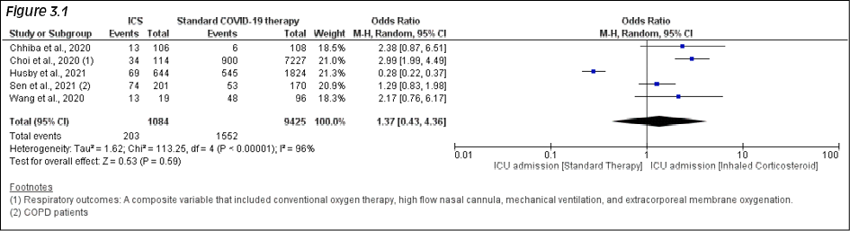 In the 5 studies reporting the need for ICU admission, ICU admission among ICS users was higher 18.7% (203/1084) in comparison to those not receiving ICS 16.4% (1552/9425). This was however not statistically significant with pooled OR 1.37 (95%CI: .43-4.36; p=.59) with 96% of heterogeneity (p<.001) Figure 3.1. We conducted sensitivity analysis as I2 was >75%. In the sensitivity analysis, the odds ratio was noted to be significant at OR 2.06 (95% CI: 1.23-3.45; p=.05) (Figure 3.2) after removing the outlying study of Husby et al.