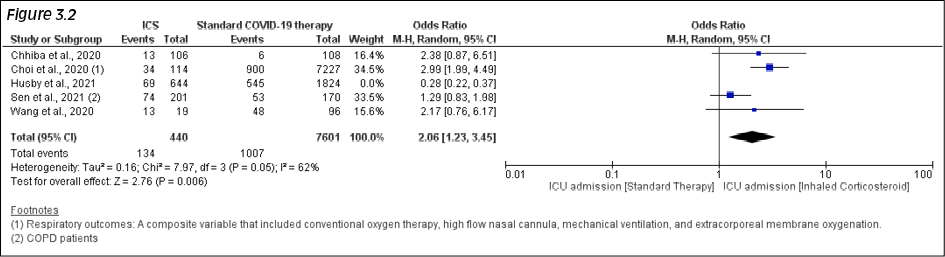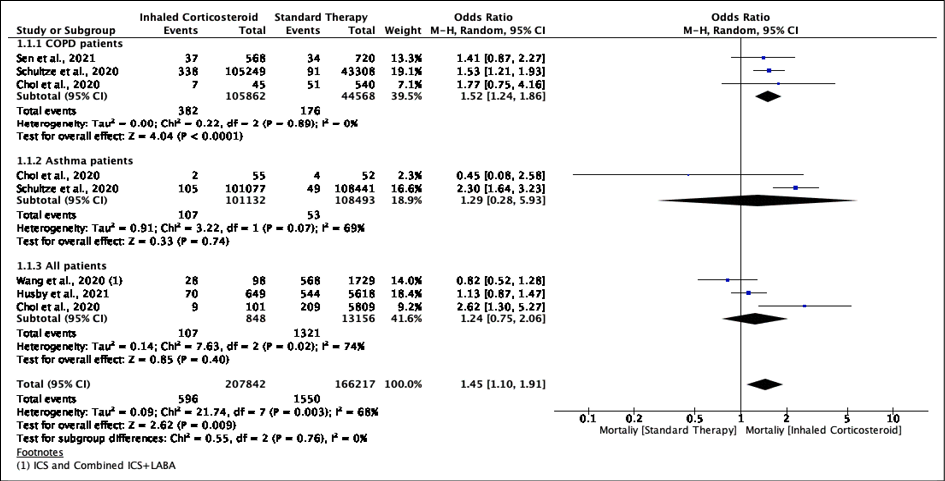 Results: Our study involves the comparison of ICS vs Non-ICS for mortality (N= 207,842 vs 166,217), ICU hospitalization (N= 1,084 vs 9,425), and the risk of hospitalization (N= 1,273 vs 1,676).Of the six studies, five reported mortality. We found a higher mortality rate in patients with asthma (60.88%, 107/160) and chronic obstructive pulmonary disease (COPD) (68.46%, 382/558) among ICS users. The overall mortality is 7.49% (107/1428). We found that ICS use was associated with higher odds of mortality (OR=1.45 95%CI: 1.10-1.91; p=0.009, I2= 68%) amongst COVID-19 patients. In subgroup analysis, higher odds of mortality among COPD patients using ICS was noted [pooled OR: 1.52 (1.24-1.86); p<0.0001; I2=0%]. However, no significant association between ICS and mortality was observed among asthma patients.