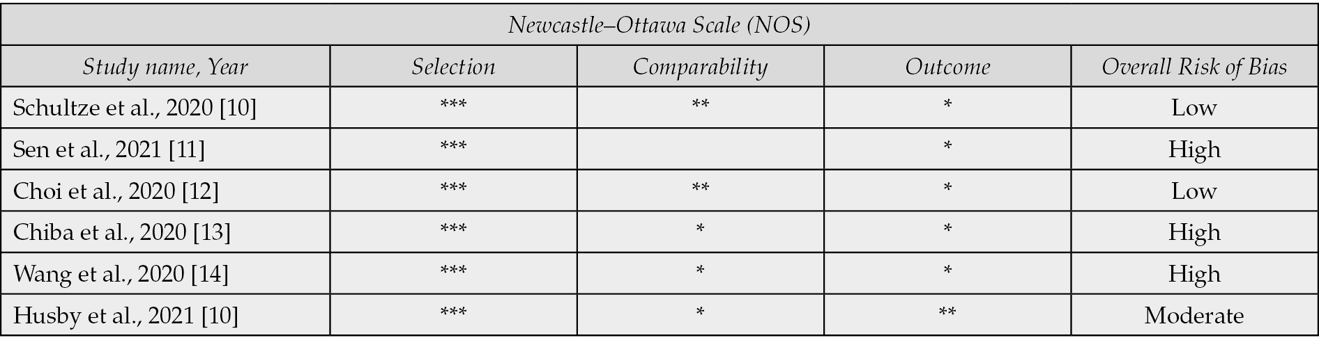 Our study has also assessed the risk of bias analysis using the Newcastle-Ottawa Scale and it shows moderate quality of evidence (Table 2).