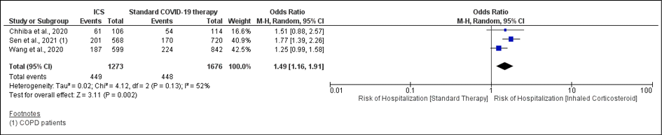Amongst the 5 studies, the prevalence of risk of hospitalization among ICS users was higher 35.27% (449/1273) in comparison to non-ICS users 26.73% (448/1676). This was also statistically significant with Pooled OR 1.49 (95%CI: 1.16-1.91; p=0.002) with 52% of heterogeneity (p.13) (Figure 4). We did not conduct sensitivity analysis as I2 was <75%.