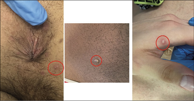 Figure 1 - The skin biopsies have been performed on lesions (highlighted by the red circles) located in the following body sites: perianal skin (erythematous eroded papule), abdomen (whitish pustule), and hand (erythematous pustule).