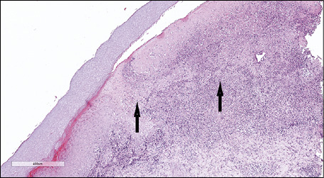 Figure 2 - Haematoxylin and eosin (H&E) stain. At scanning magnification (10x) the histopathology showed a broad dermo-epidermal ulceration with an underlying purulent base (arrows).