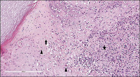 Figure 3 - Haematoxylin and eosin (H&E) stain. At higher magnification (40x), the epidermis was characterized by necrotic keratinocytes with pycnotic nuclei and dense eosinophilic cytoplasm (arrowhead) and by scattered keratinocytes with a “shadow cell” appearance (enlarged cells with eosinophilic cytoplasm without well-defined nuclei) (arrow); suppurative changes were detected in the papillary dermis characterized by marked neutrophilic exocytosis (asterisk).