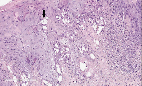 Figure 4 - Haematoxylin and eosin (H&E) stain. The keratinocytes showed ballooning degeneration (arrow): keratinocytes appear swollen, pale, and round due to intra-cellular oedema and loss of intercellular bridges (magnification 40x).