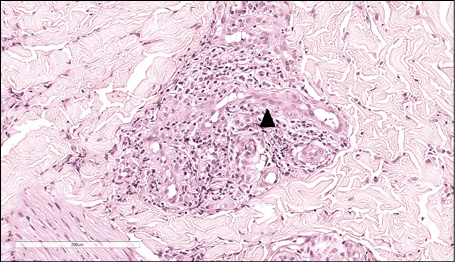 Figure 5 - Haematoxylin and eosin (H&E) stain. An interstitial and perivascular/peri-adnexal inflammatory infiltrate composed of neutrophils and lymphocytes was observed in the deep dermis, associated with endothelial swelling (arrowhead) without fibrinoid necrosis of the vascular wall (magnification 40x).