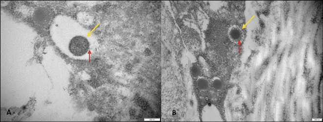 Figure 6 - Transmission electron microscopy. Epidermal-dermal extracellular environment: viral particles with an electron-dense core (yellow arrow) and a surface characterized by inhomogeneously (A, red arrow) or evenly distributed protrusions “threads” (B, red arrow) near the collagen fibers (magnification: 50000x [A], 30000x [B]).