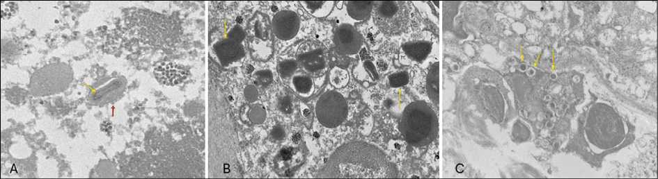 Figure 7 - A) Transmission electron microscopy. Epidermal intracellular environment (keratinocytes): virions showed a biconcave-shaped central core (yellow arrow), surrounded by lateral bodies and an external membrane with typical threads (red arrow), magnification 30000x; virions also appeared as rectangular, brick-shaped particles (B, yellow arrow), magnification 15000x, or as oval particles with eccentric nucleoids like “frog spawns” (C, yellow arrow), magnification 10000x.