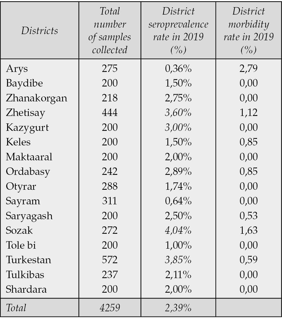 Table 2 - Distribution of CCHF seroprevalence and morbidity rate findings across the districts of Turkestan Region.