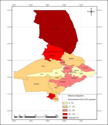 We also studied CCHFV seroprevalence and morbidity rate in the districts of Turkestan region. As a result, the highest rates were detected in the following districts: Sozak District - 4.04%; Turkestan - 3.85%; Jetisu Region - 3.60%; Kazygurt - 3.00% (Table 2, Figure 1).