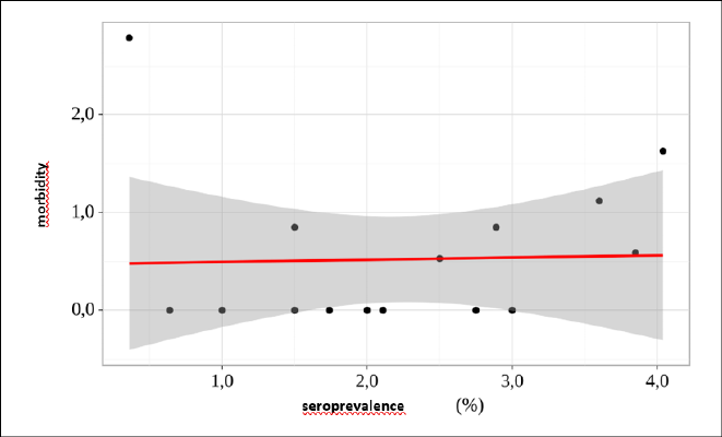 Thus, the morbidity rate rise by 0.023 is observed as a result of 1% seroprevalence increase. The obtained model explains 0.1% of the observable dispersion in the morbidity rate (Figure 3).