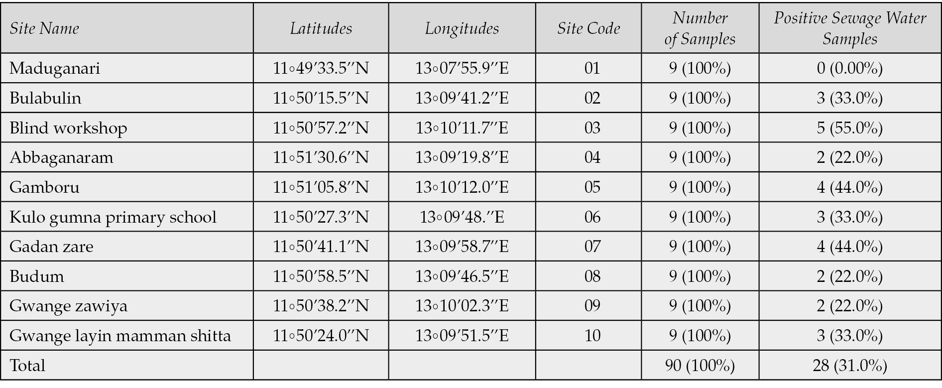 Nine sewage water samples each were collected from 10 different sewages water sites in highly impoverished and overcrowded urban area characterized by poor housing and living conditions in Maiduguri from December 2020 to April 2021. All procedures were done according to the guidelines on environmental surveillance for detection of Polioviruses, 2015 [15].