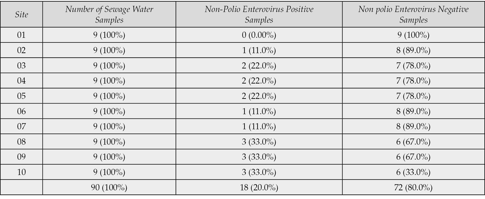 Table 2 indicates the results of non-polio enteroviruses (NPEVs) found in the sewage water samples. According to the result, there was no NPEV in all the nine sewage water samples in site 01. However, cell culture isolate of one sewage water sample in site 02 shows the presence of NPEV. In the third site, two sewage water samples contain NPEVs. Also two sewage water samples contain NPEV in site 04 and likewise in the fifth site. Meanwhile in the sixth and seventh site, only one sewage water sample each contain NPEV. Non polio enteroviruses were present in three sewage water samples each in the eighth, ninth and tenth sites. Generally, out of the ninety sewage water samples only eighteen sewage water samples contain NPEVs.