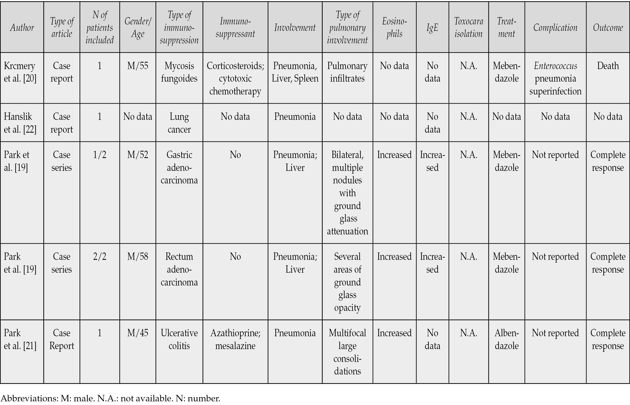 The main aim of this work was to summarize current evidence on pulmonary involvement during Toxocara spp. infections in immunosuppressed adults patients to understand clinical characteristics, treatment, and outcome.