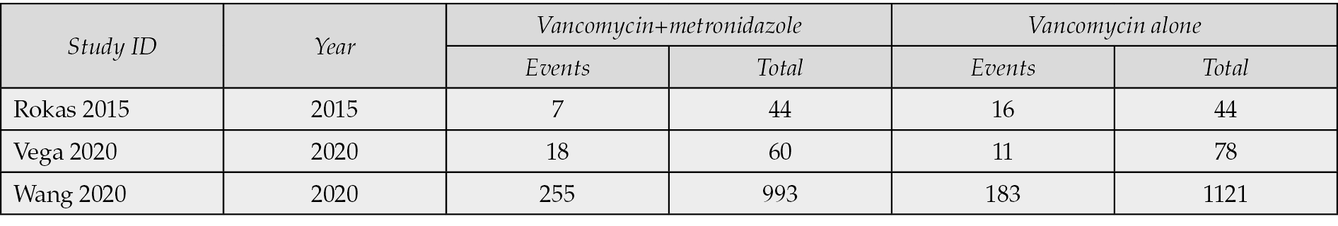 To conduct the statistical analysis, data from three [9-11] out of the four [9-12] studies cited by ESCMID and IDSA guidelines were extracted. The purpose was to compare the mortality of C. difficile patients who were treated with vancomycin alone or combination therapy. The excluded study did not compare vancomycin alone versus metronidazole plus oral vancomycin [12]. The meta-analysis was performed using SPSS© ver. 28.0.1.0 by a random effect model to assess the mortality risk associated with the treatment. The statistical analysis did not consider the dosage of vancomycin as all the studies had aggregated data for this variable.