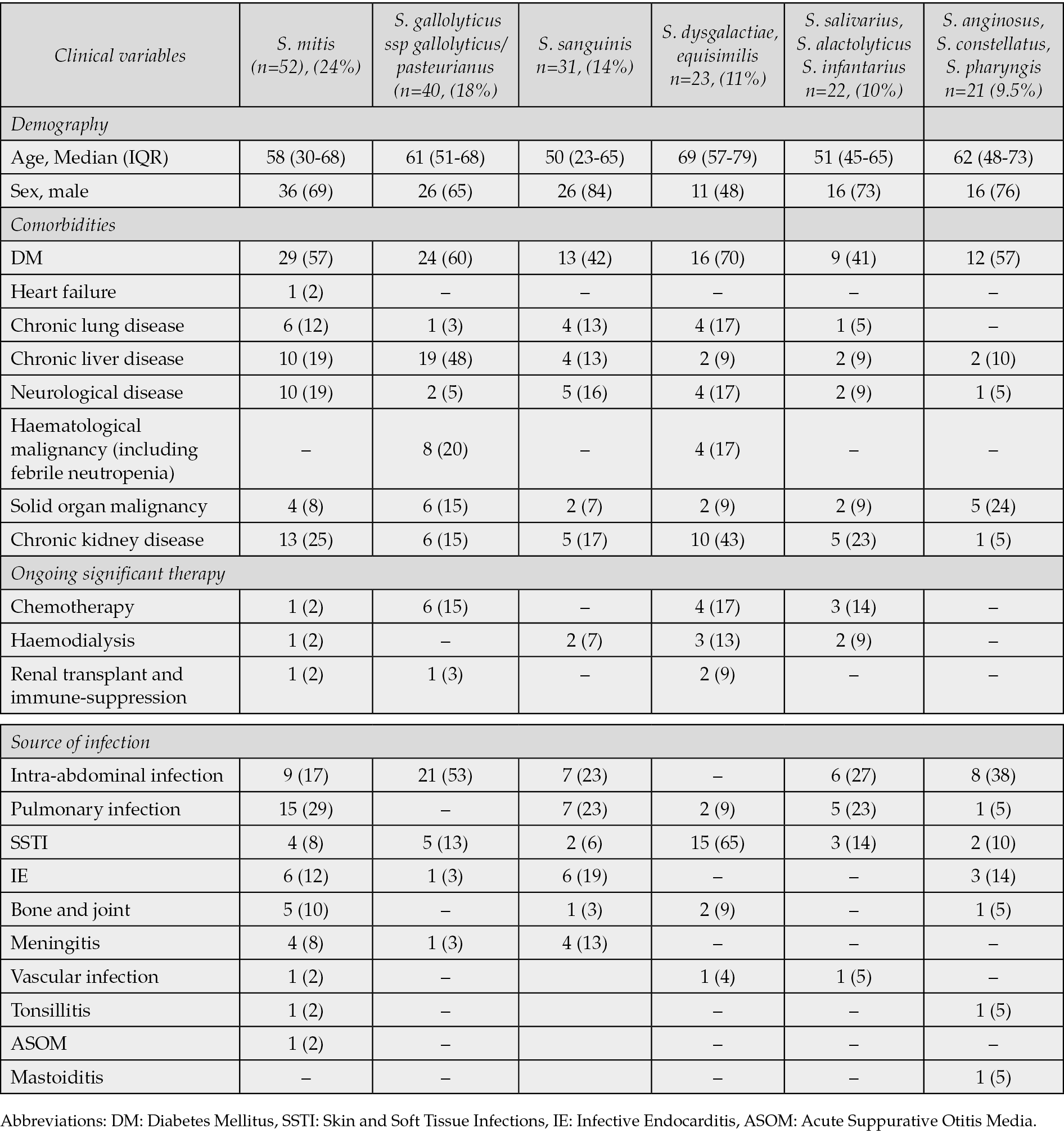 Patient characteristics, clinical manifestations, and outcomes were compared between the 6 commonly occurring species, S. mitis group, S. gallolyticus group, S. sanguinis group, S dysgalactiae group, S. salivarius group and S. anginosus group (Table 1) and is discussed below.