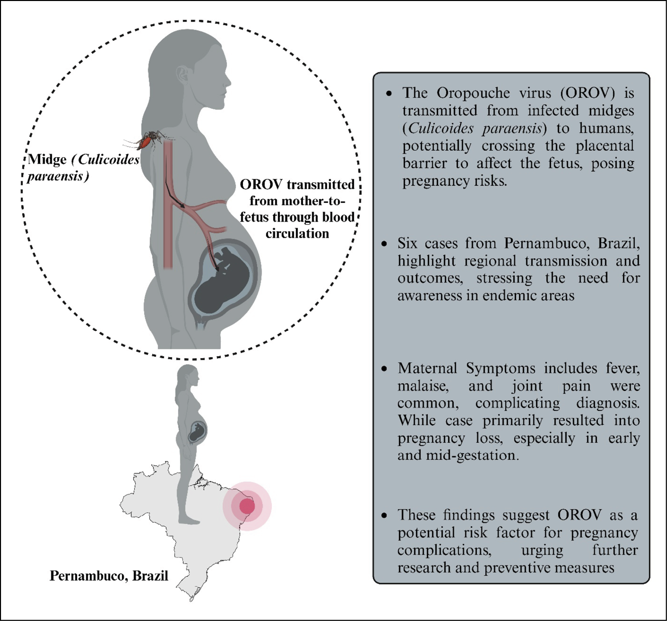 The Pernambuco cases raise critical gaps in our understanding of OROV and its impact on pregnancy, necessitating proactive public health approaches. In general, healthcare providers should especially consider OROV as part of the differential diagnosis of febrile illnesses among pregnant women in endemic areas. Because there are adverse outcomes such as miscarriage, fetal growth restriction, and possible neurological impact related to the virus, it is highly recommended that the clinical approach be highly structured. The patient should have regular ultrasounds, like that of ZIKV, where ultrasounds are usually conducted every 4-6 weeks to monitor fetal growth restriction, microcephaly or other developmental abnormalities [8, 9]. As there are no antiviral treatments available against OROV, symptom-alleviating medications are provided for symptoms such as fever, pain, and haemorrhagic phenomena while pregnant to manage associated complications and reduce inflammation. For high-risk fetal infection cases, especially after having an abnormal ultrasound, the test for OROV is done through amniocentesis in amniotic fluid, as commonly done in the case of ZIKV. If positive for OROV, pregnant women should consult neonatal units for potential complications. Newborns should undergo complete neurological and developmental assessments with ongoing follow-up for possible delays. Preventive counselling and education on using insect repellents, wearing protective clothing, using mosquito nets, and eliminating breeding sites are essential to reduce exposure and transmission risks, protecting both mother and fetus [8, 9].