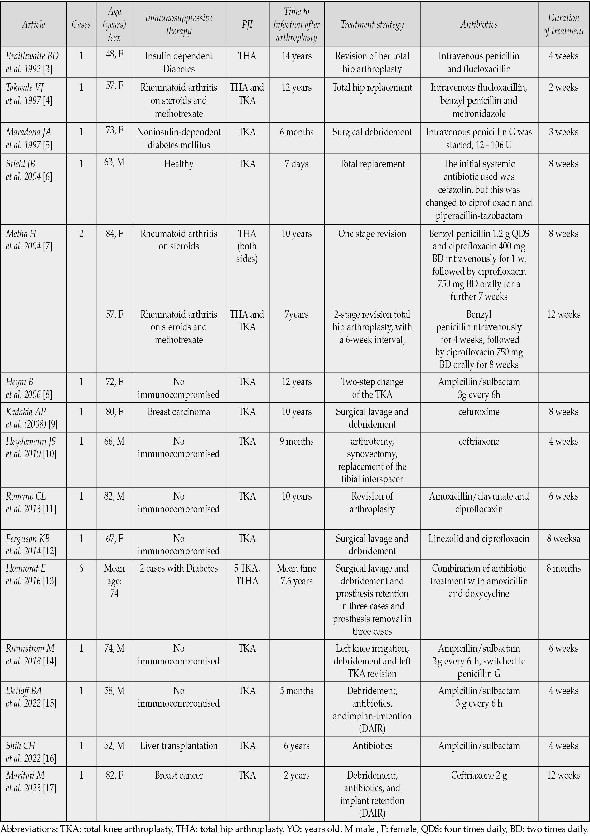 Search results were limited to articles written in the English-language. There were 14 publications; 6 were found in PubMed and 8 in Google Scholar (the first one was reported in 1992 and the last one was reported in 2023) (Table 1) [3-17]. Out of the 21 cases, most were male, with an average age of 68 years. The majority had total knee arthroplasty. Most patients underwent surgical replacement combined with beta-lactam antibiotics (ampicillin-sulbactam, amoxicillin, piperacillin/tazobactam).