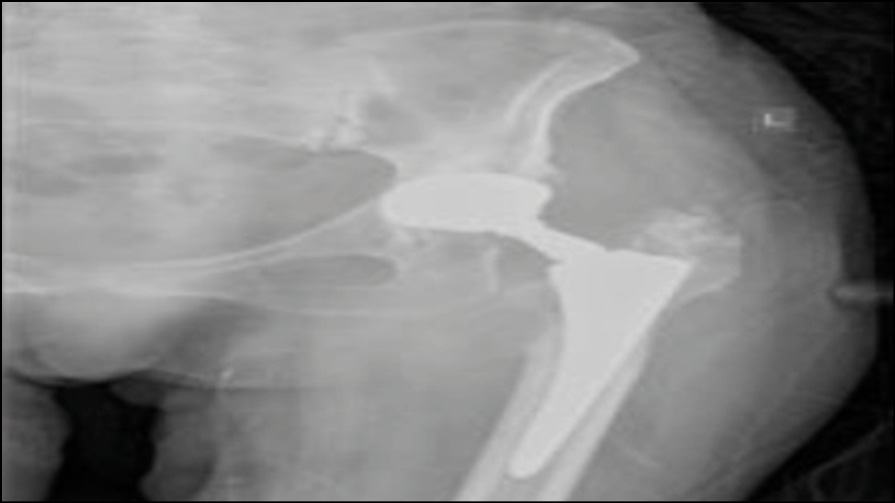 Figure 1 - AP X-Ray of the Left Hip Join: Findings compatible with Total Hip Arhtroplasty. No obvious alteration around the implant for example: no loosening signs.