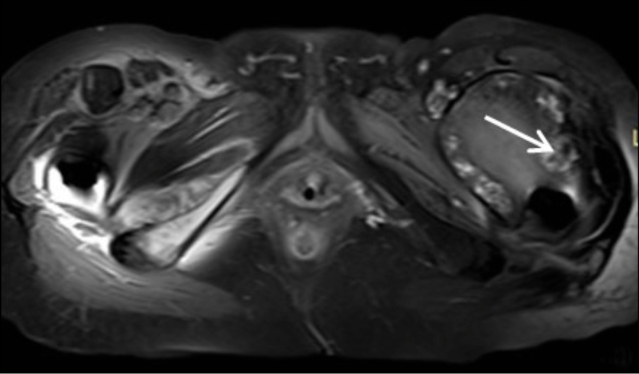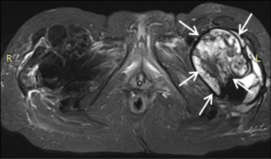 Figure 2a - Axial STIR image at the level of femoral neck. Large encapsulated multilobular fluid collection with internal septa is observed adjacent to the endoprosthesis of the left hip joint (white arrows).