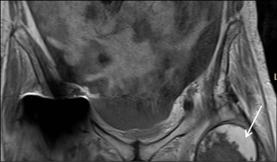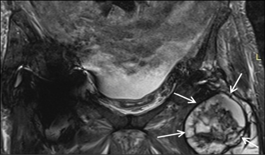 Figure 2b - Coronal STIR image at the level of pubic bone. Large encapsulated multilobular fluid collection with internal septa is depicted adjacent to the endoprosthesis of the left hip joint (white arrows).