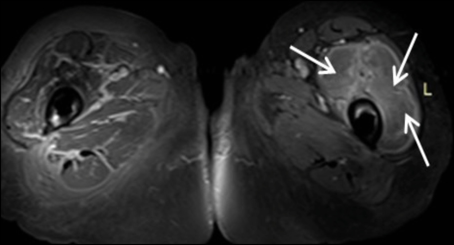 Figure 2e - Axial T1 post Gd Fat –Suppression image at the level of proximal femur. White arrow shows abscess formation in the left rectus femoris and the vastus laterali.