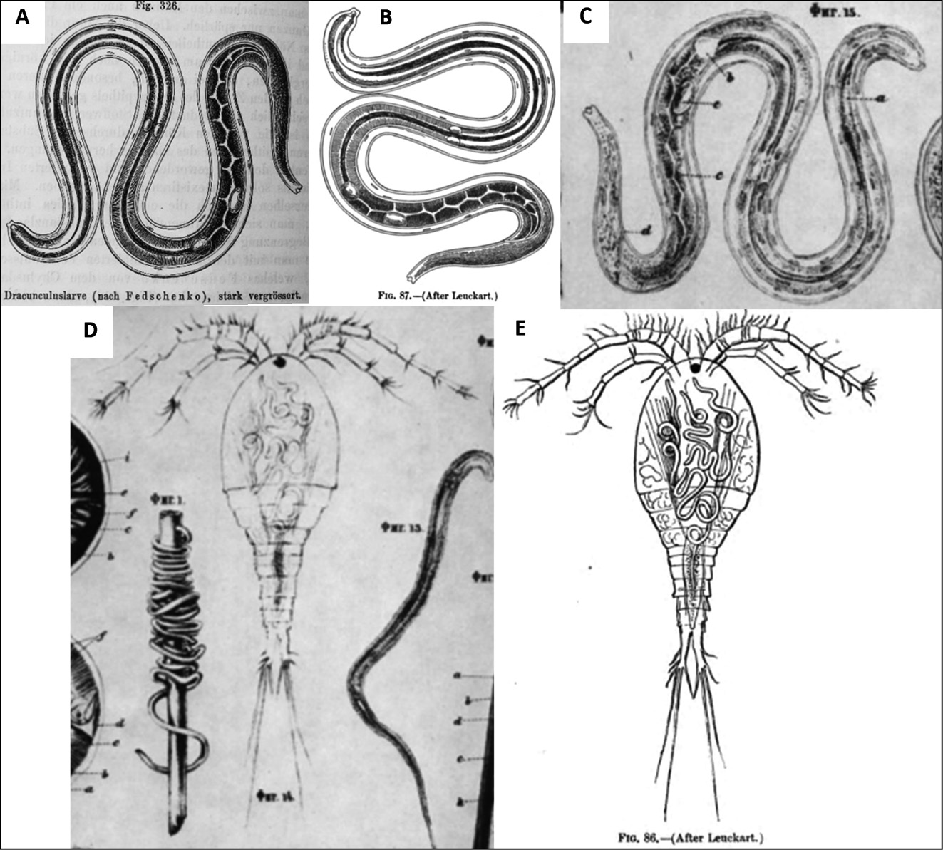 Figure 1 - Diagrams of guinea worm larvae, by Leuckart (A), Manson (B), and Fedchenko (C); and infected cyclops, by Fedchenko (D) and Manson (E).