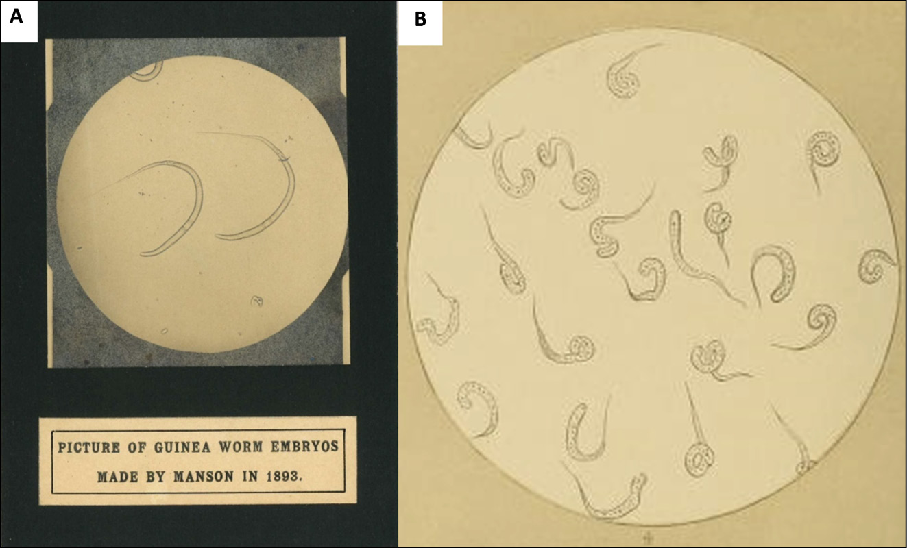Figure 2 - Images of guinea worm larvae by Manson (A; Courtesy, London School of Hygiene & Tropical Medicine, LAORS, Archive Service) and Cobbold (B).