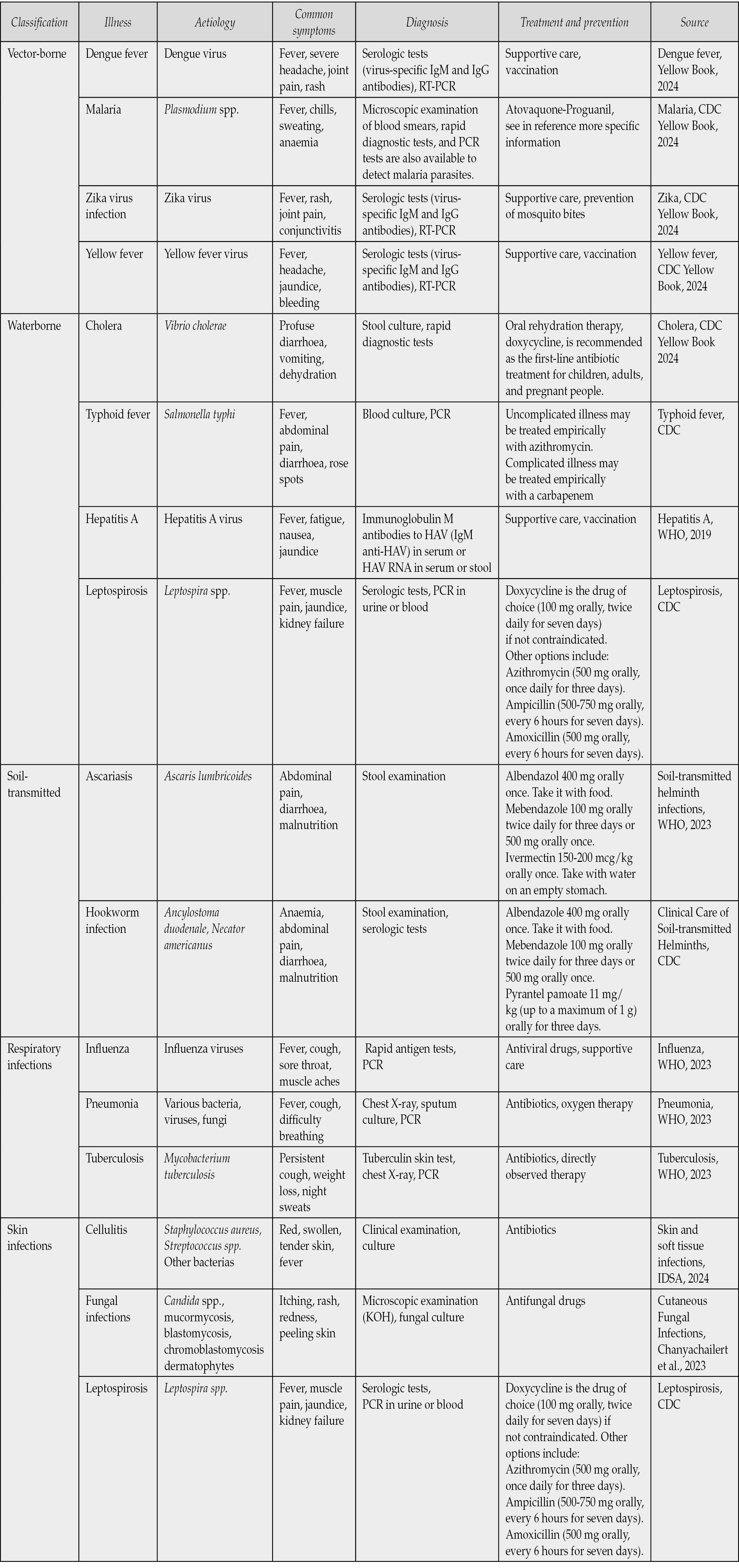 Table 1 - Aetiology, diagnoses, and first-line recommended treatments for frequent infectious and tropical floods-related diseases.