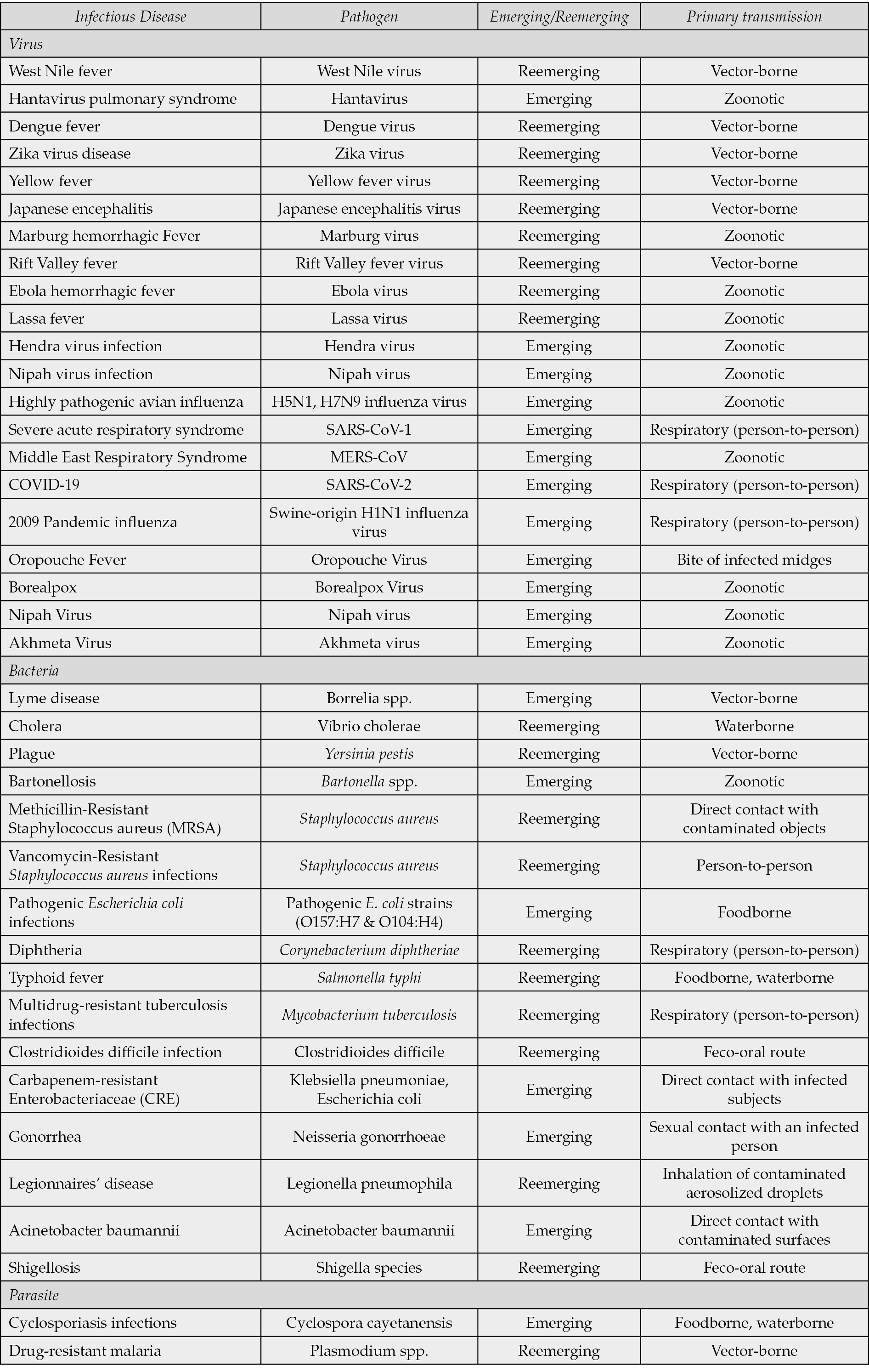 Table 1 - Cases of some emerging and re-emerging infectious diseases infecting humans.