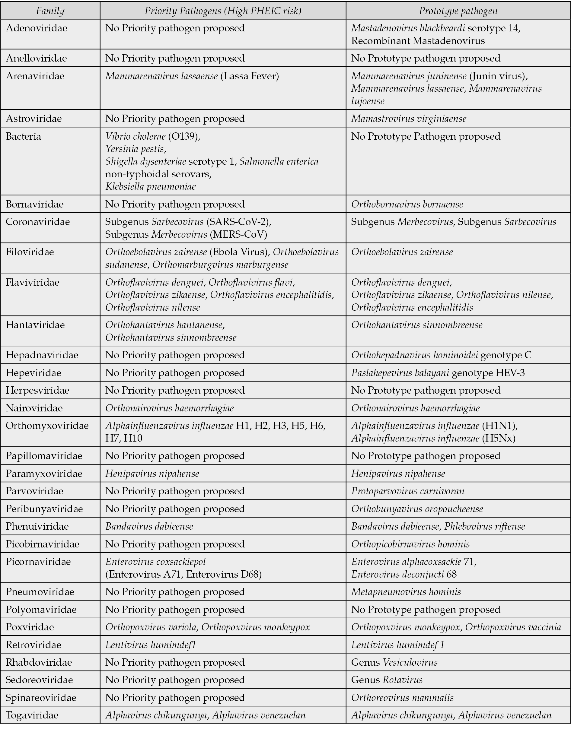 Table 2 - Priority pathogens and prototype pathogens (WHO, 2024).