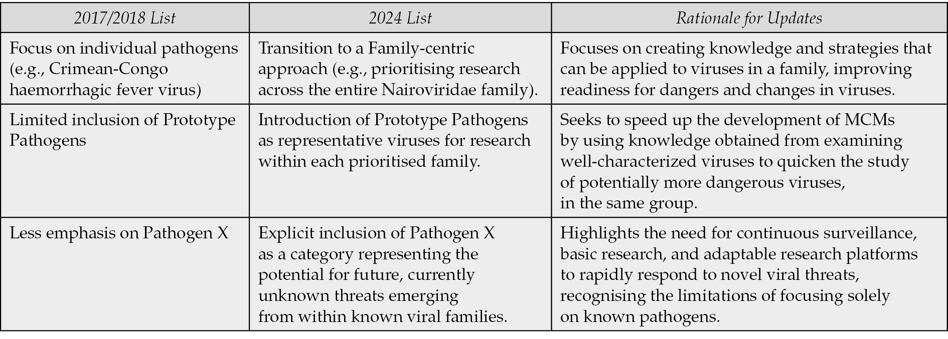 The 2024 update addresses this by examining all families and acknowledging that any family, currently viewed as low risk, could trigger a future pandemic. This recognizes that evolutionary changes could turn low-risk families into major threats due to genetic alterations or environmental shifts [38]. A notable advancement in the 2024 compilation is the inclusion of Prototype Pathogens (Table 1). These pathogens, chosen from families known for their potential to cause public health emergencies, serve as research models for their respective families [42]. The selection criteria for Prototype Pathogens included their pathogenic significance, understanding of their replication and disease mechanisms, and the availability of animal models for human disease research [38]. Studying Prototype Pathogens allows researchers to develop broadly applicable medical countermeasures (MCMs) that are versatile and quickly adaptable to various pathogens within the same family, including new emerging threats [43]. This proactive approach contrasts with developing MCMs tailored to specific pathogens, which often proves inadequate during rapidly evolving pandemics like COVID-19 [44]. Emphasizing preparedness, the 2024 plan introduces the concept of Pathogen X, representing a potential future pandemic threat [38, 41]. This placeholder underscores the need for continuous global monitoring, fundamental research, and adaptive R&D strategies. Recognizing Pathogen X necessitates shifting from a reactive pathogen-focused approach to understanding evolutionary trends and the potential for interspecies transmission (Table 2) [38].