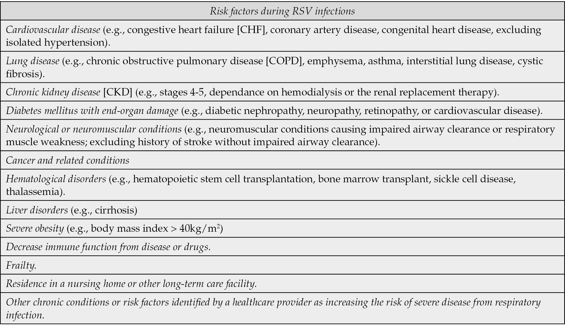 Table 1 - Conditions that have been identified as risk factors for individual over 65 years old for the risk of poor outcomes during RSV infections. The list is inspired by ACIP’s general best practice guidelines for COVID-19 immunizations and is not exhaustive of all potential risk conditions [36].