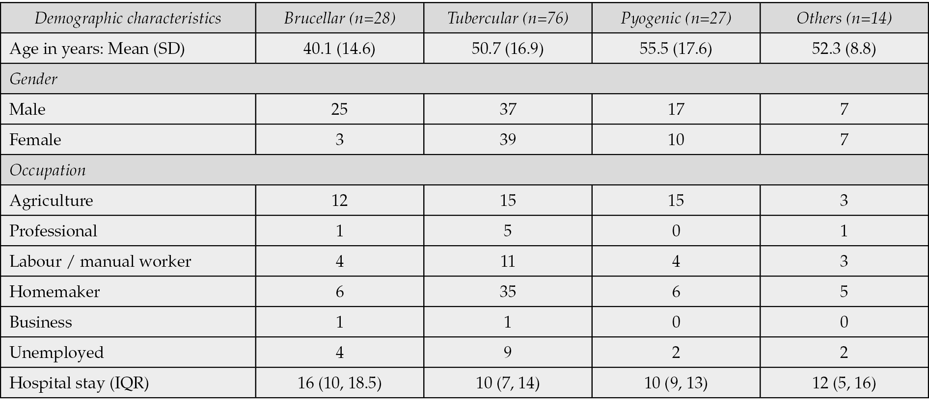 The demographic profile of patients with spondylodiscitis varied across different infectious types (Table 1). Brucellar spondylodiscitis patients (n=28) had a relatively younger mean age of 40.1 years (SD 14.6), while tubercular spondylodiscitis patients (n=76) exhibited a higher mean age of 50.7 years (SD 16.9). Pyogenic spondylodiscitis patients (n=27) and those categorized under ‘Others’ (n=14) had mean ages of 55.5 years (SD 17.6) and 52.3 years (SD 8.8), respectively. Gender distribution also varied among the different types of spondylodiscitis, with discernible differences in occupation and duration of hospital stay. Patients with brucellar spondylodiscitis needed a more extended hospital stay compared with others.