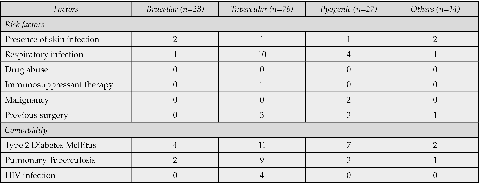 Table 2 - Presence of risk factors and comorbidities of patients diagnosed with spondylodiscitis.