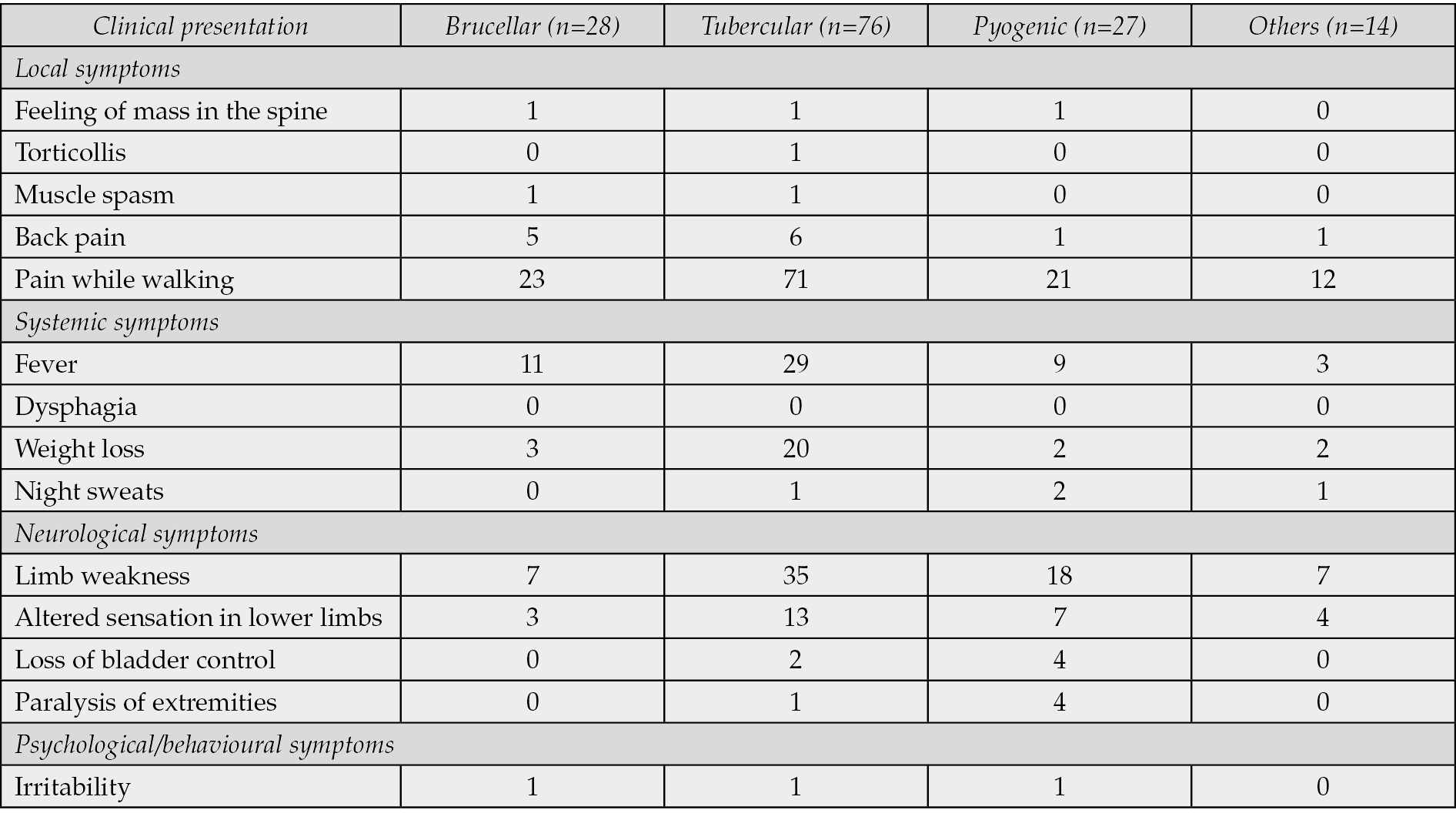 Table 3 - The clinical presentations of patients with spondylodiscitis.