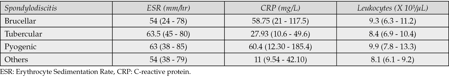 Laboratory findings revealed notable differences in erythrocyte sedimentation rate (ESR), C-reactive protein (CRP) levels, and leukocyte counts among different spondylodiscitis types (Table 4). Tubercular spondylodiscitis patients exhibited higher median ESR levels compared to other categories, while CRP levels varied significantly across the groups.