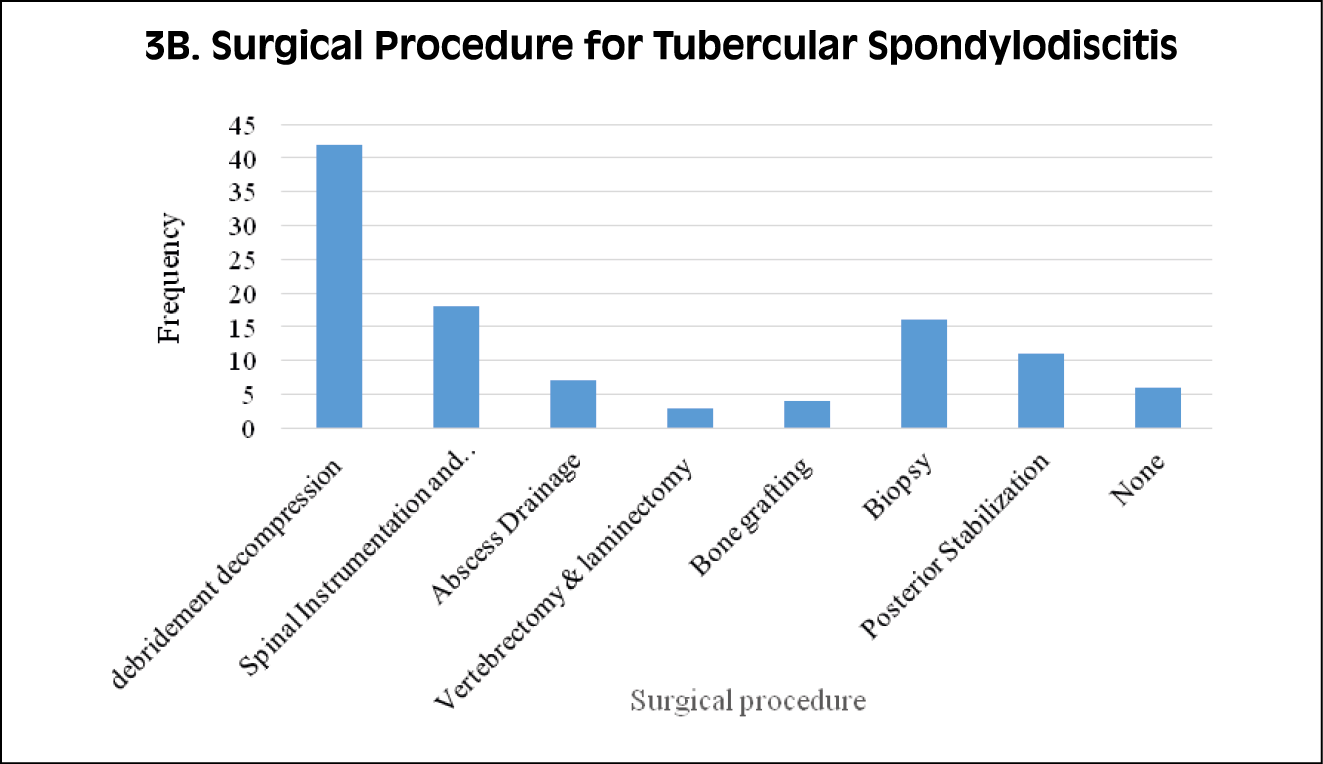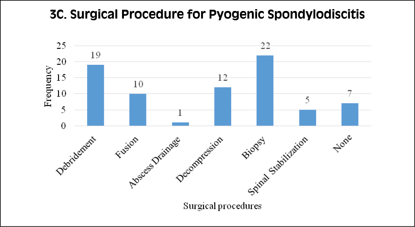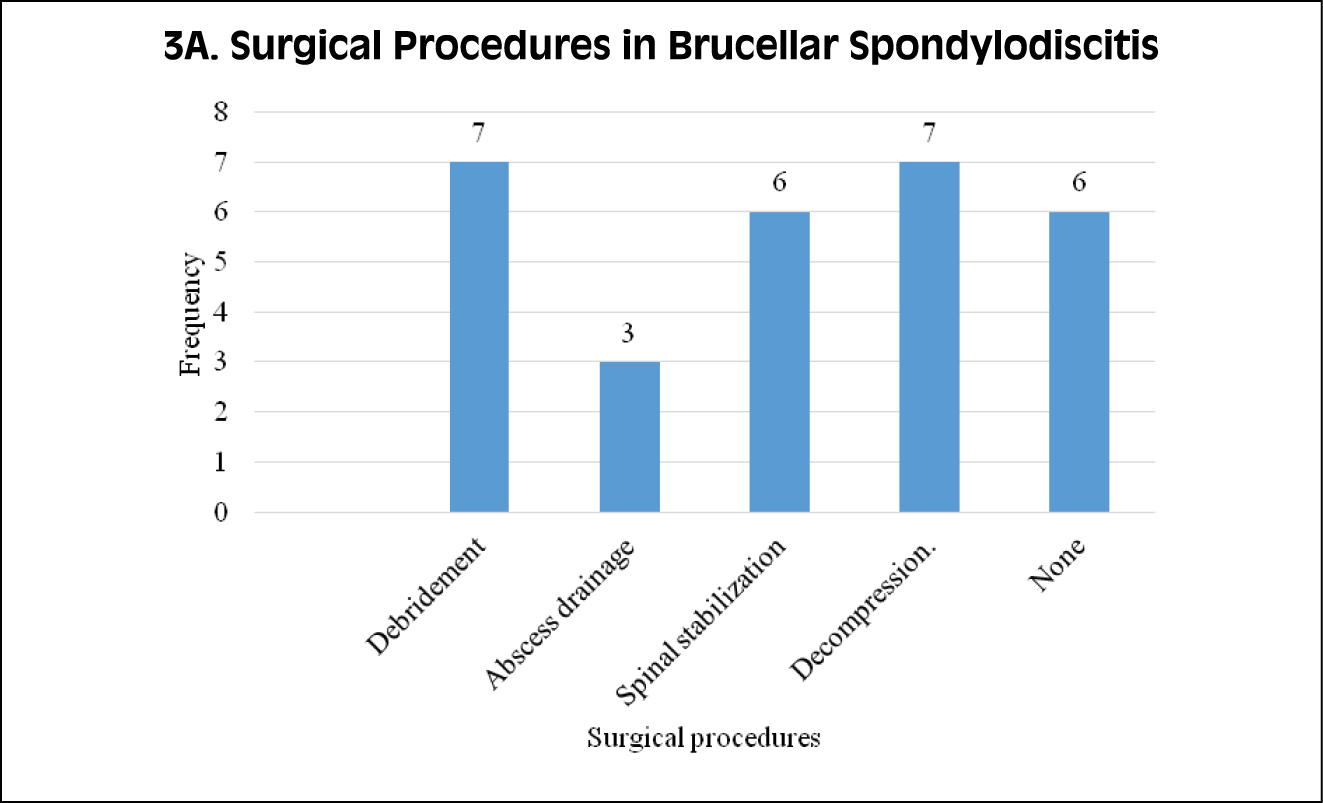 The primary surgical approach for both tubercular and brucellar spondylodiscitis commonly involved debridement and decompression procedures (Figure 3). In the case of pyogenic spondylodiscitis, the surgical interventions performed included biopsies, and six individuals required multiple surgeries.