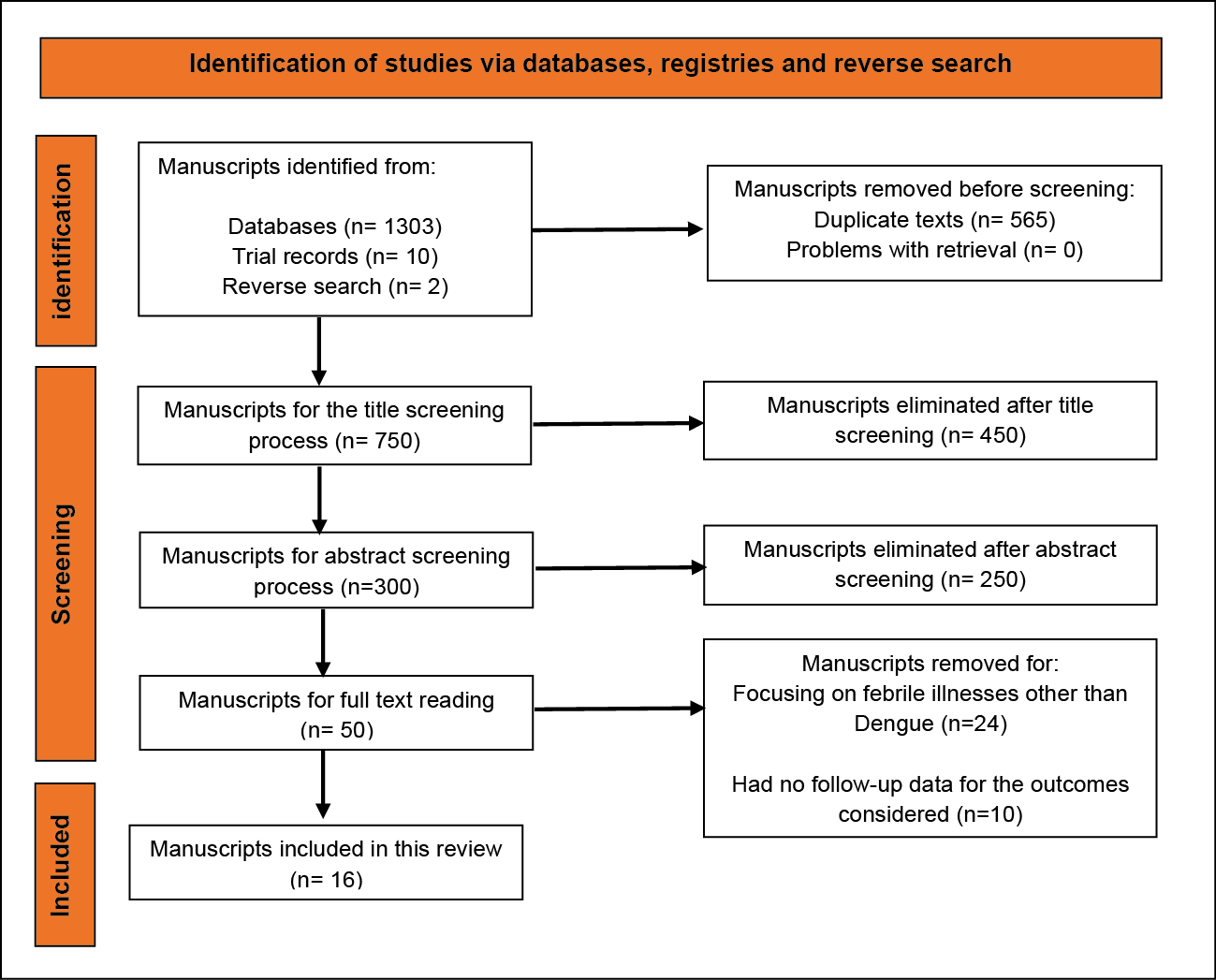 Searches were performed in various databases, obtaining 334 records in Medline, 553 in Scopus, 366 in Web Of Science, 50 in Scielo and 10 in CENTRAL, and two manuscripts by reverse search. One thousand three hundred and fifteen manuscripts were imported into Rayyan AI®, eliminating duplicates and leaving 750 texts. After a review by title, 450 were discarded, leaving 300 for reading abstracts. Of these, 250 did not meet the inclusion criteria, and 50 were read in complete text. Of these last 50 manuscripts, 34 were eliminated: 24 for addressing other febrile diseases and 10 for treating fever in pregnancy without considering relevant outcomes. Finally, 16 papers were included for the final analysis. The diagram summarizing the screening process according to the PRISMA methodology is shown in Figure 1.