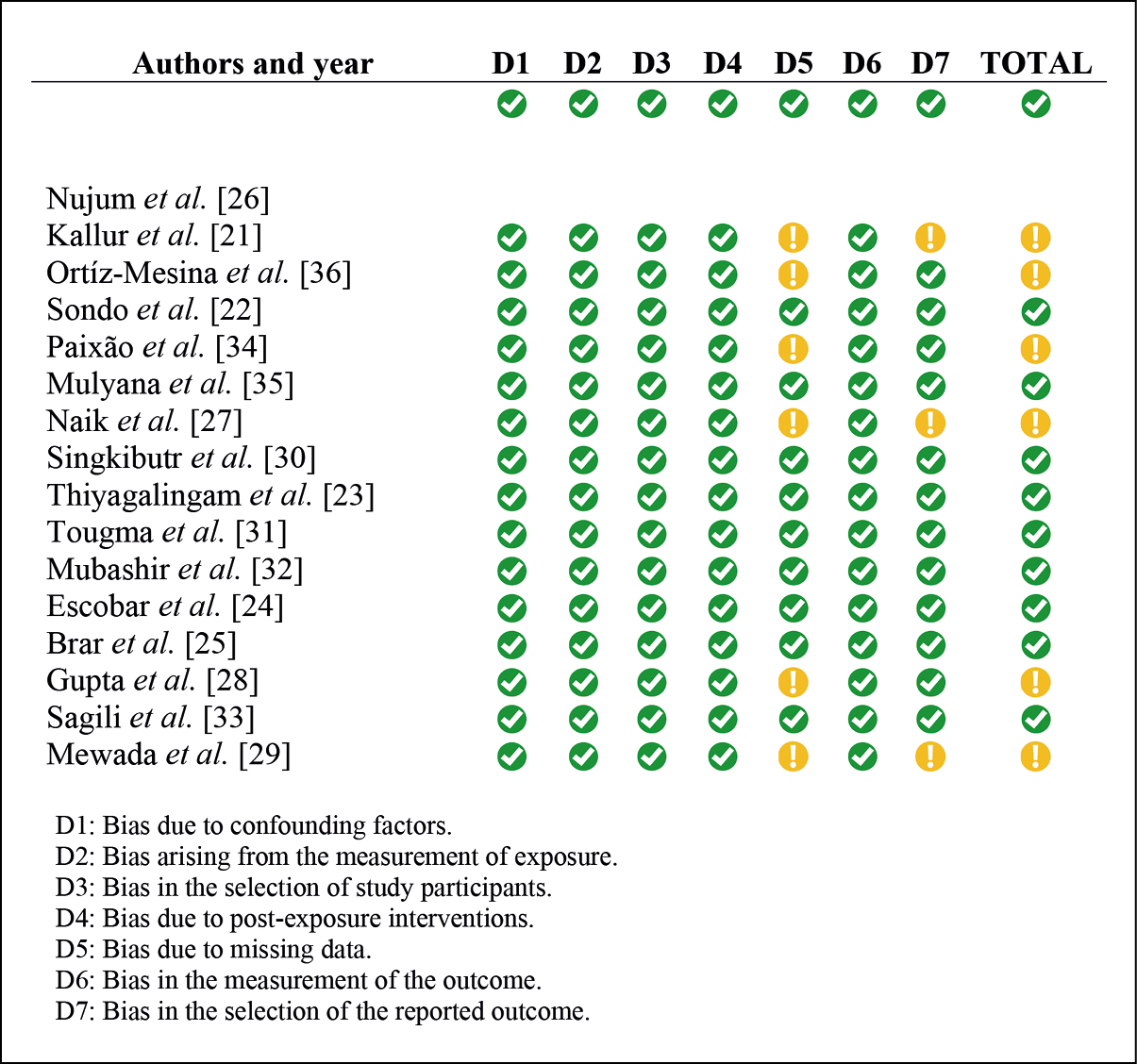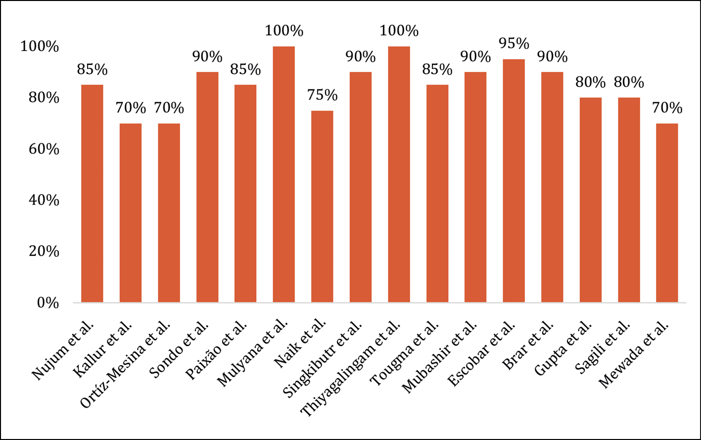 Regarding the typology of the manuscripts, all were observational. The studies by Kallur et al., Sondo et al., Thiyagalingam et al., Escobar et al., and Brar et al. were cross-sectional [21-25]. The studies by Nujum et al., Naik et al., Gupta et al. and Mewada et al. were prospective cohort studies [26-29]. Meanwhile, the studies by Singkibutr et al., Tougma et al., Mubashir et al. and Sagili et al. were retrospective cohort studies [30-33].