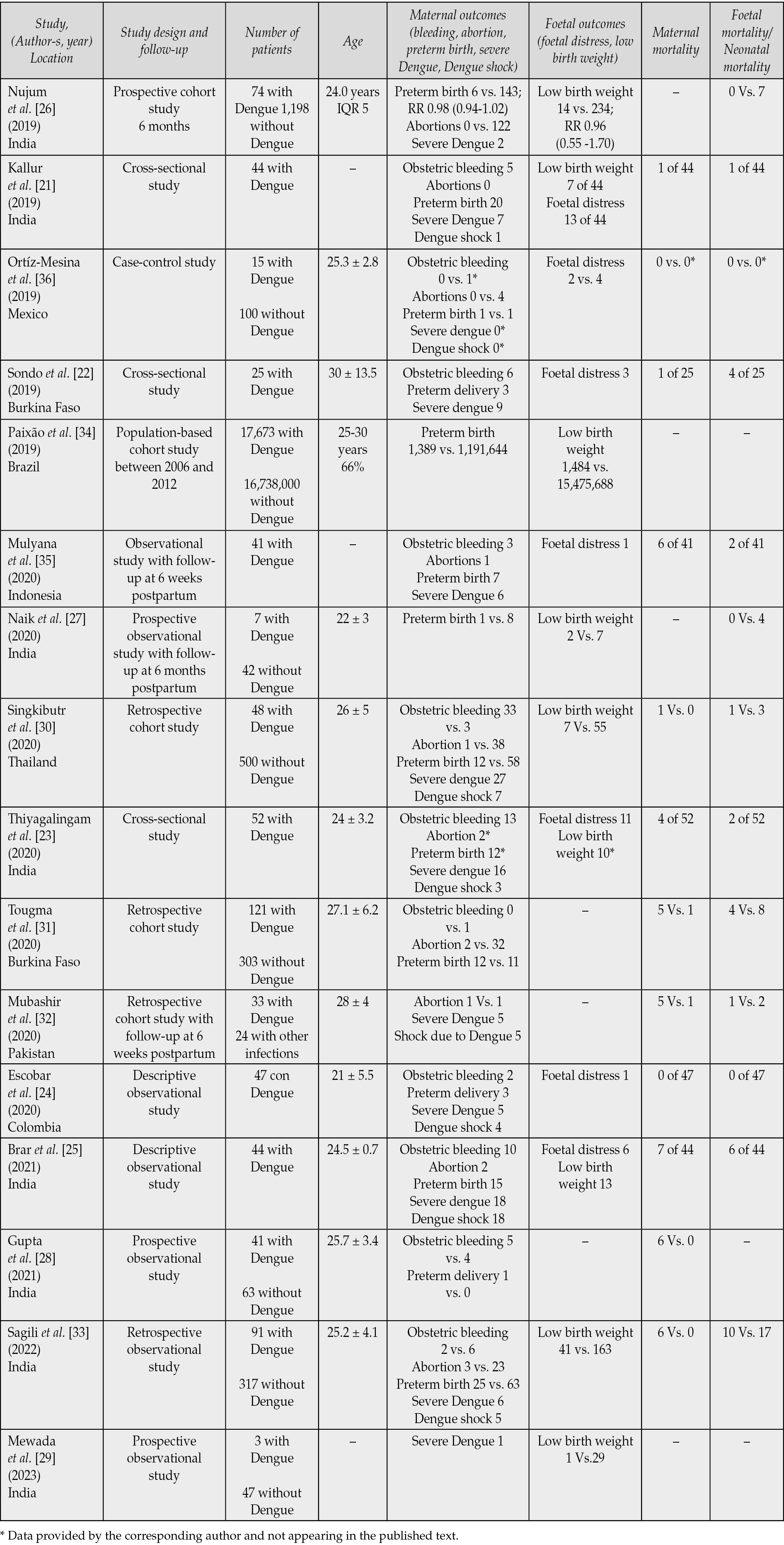 Conclusions: Dengue infection during gestation carries significant maternal health risks, including complications such as bleeding, miscarriage and preterm delivery. In addition, it is associated with foetal distress and low birth weight, as well as increased foetal and neonatal mortality, highlighting the need for vigilance and appropriate medical care.