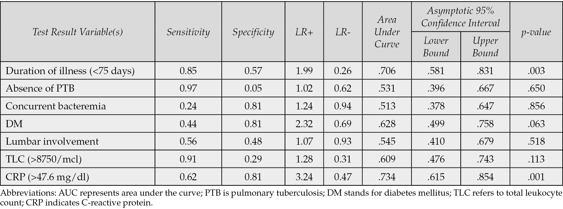 Figure 2 - Individual ROC curves of the parameters used in the scoring system. Abbreviations: DOI- Duration of illness, concur bact- concurrent bacterial infection, PTB refers to pulmonary tuberculosis; DM denotes diabetes mellitus; Lumbar- lumbar vertebrae involvement, TLC stands for total leukocyte count; CRP is C-reactive protein; ROC indicates receiver operating characteristic.