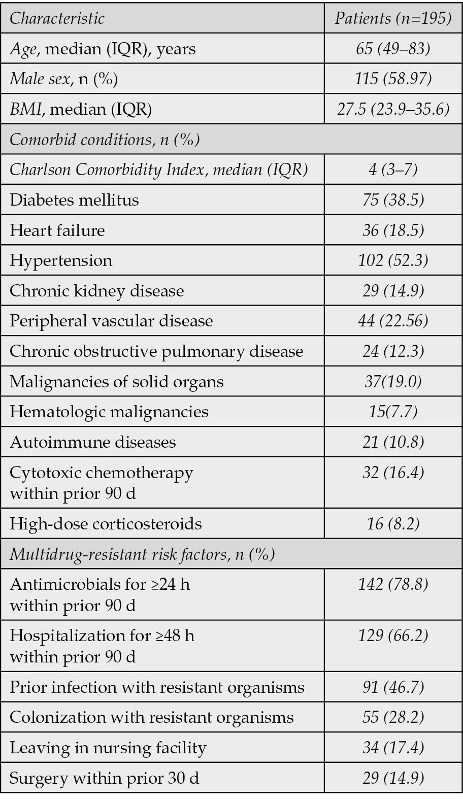 A total of 195 patients were included in the analysis. The flowchart summarizing the study design and the patient inclusion process is shown in Figure 1. The median age was 65 years (interquartile range, 49-83) and 58.97% of patients were male (Table 1). The median body mass index (BMI) was 27.5 (IQR, 23.9-35.6). The cohort had a high burden of comorbidities, with a median Charlson Comorbidity Index of 4 (IQR, 3-7). The most frequent comorbidities were hypertension (52.3%), diabetes mellitus (38.5%), and heart failure (18.5%). Consistent with the study’s focus, a substantial portion of the cohort had multidrug-resistant risk factors, including recent antibiotic exposure (78.8%) and hospitalization (66.2%). Illness severity was high, with a median APACHE II score of 14 (IQR, 9-22), and 13.3% of patients were admitted to the Intensive Care Unit (ICU) at the time of index culture (Table 2).