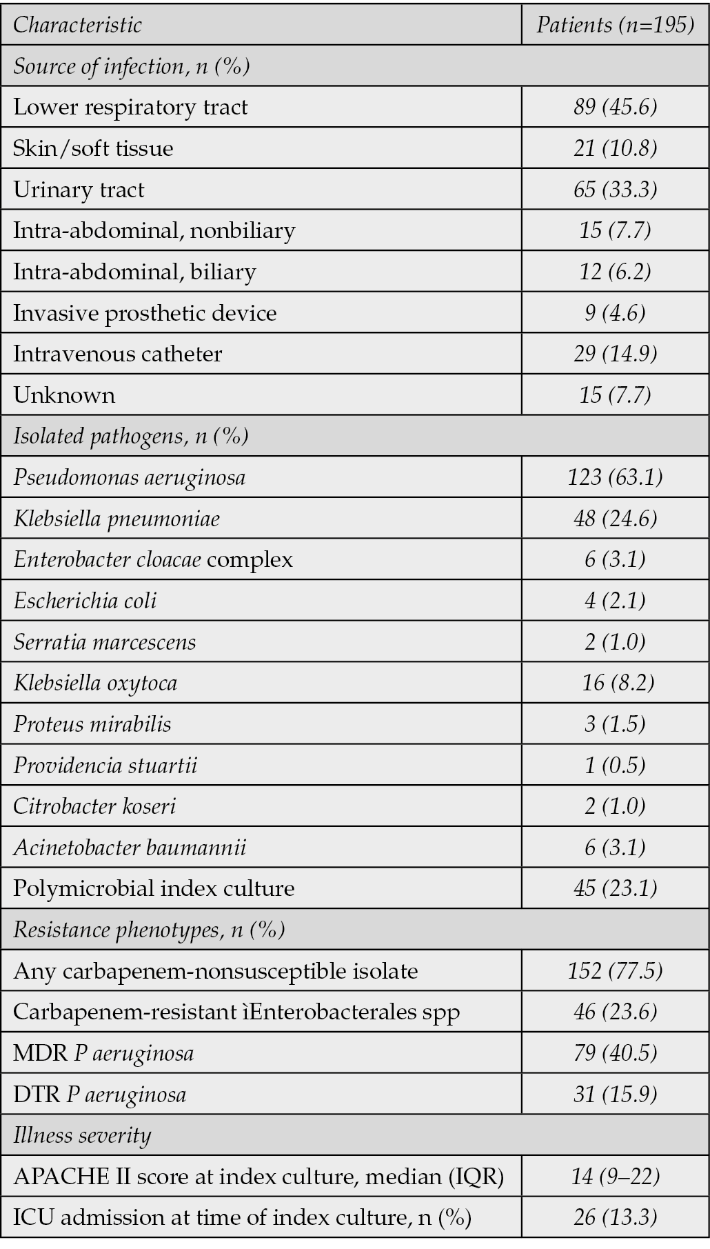 Table 1 - Clinical characteristics of study participants (n=195).