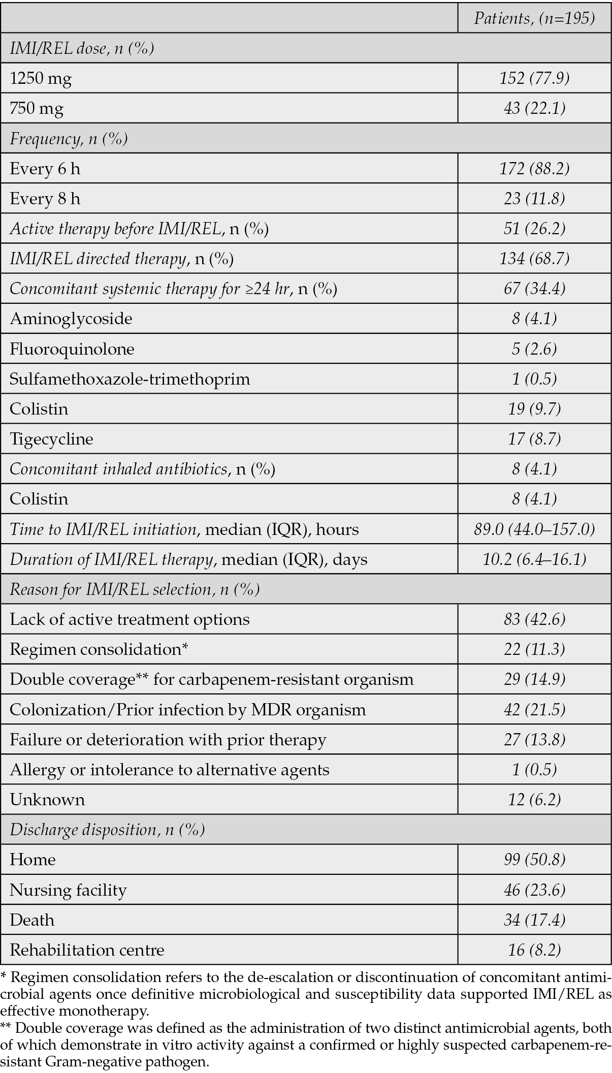 The most common source of infection was the lower respiratory tract (45.6%), followed by the urinary tract (33.3%) and intravenous catheter infections (14.9%) (Table 2). The median duration of IMI/REL therapy was 10.2 days (IQR, 6.4-16.1) (Table 3). The drug was administered primarily at a dose of 1250 mg (77.9%) every 6 hours (88.2%). Of the 195 patients included in the study, 51 (26.2%) were receiving active antimicrobial therapy immediately prior to the initiation of IMI/REL. The decision to switch to IMI/REL in these cases was driven by critical clinical and microbiological considerations. The primary reasons for this change included documented clinical deterioration or lack of adequate response to the prior antimicrobial regimen, microbiological guidance indicating in vitro non-susceptibility or suboptimal activity of the current agents against the isolated DTR Gram-negative pathogen, or clinical judgment to escalate therapy due to severe infection or specific resistance patterns for which IMI/REL was seemed a more appropriate and effective option.