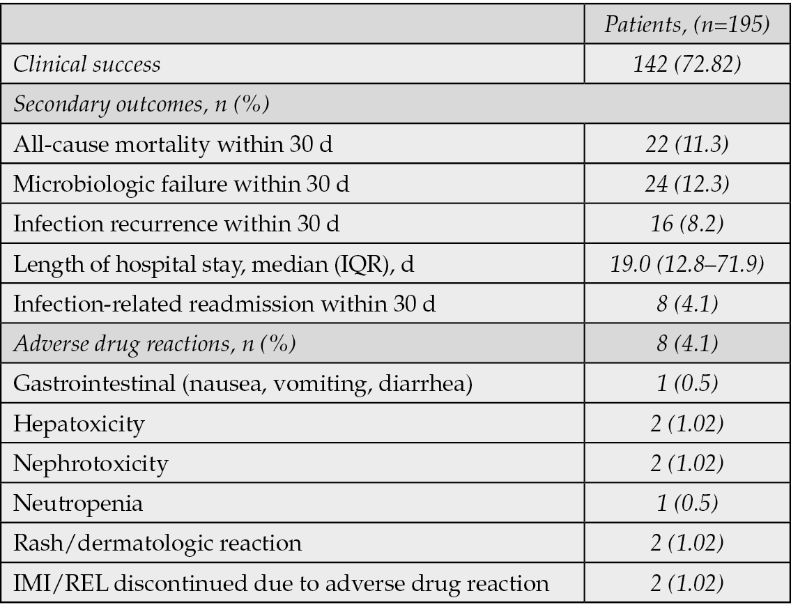 Data were extracted from patient medical records, encompassing demographics, clinical characteristics, microbiological findings, and details regarding the administration of IMI/REL. The source of infection, isolated pathogens and their resistance phenotypes were meticulously recorded. The primary outcome was the clinical success, defined as improvement or resolution of infection-related signs and symptoms at the end of treatment. The assessment of clinical success was determined by the documented evidence extracted from the patient’s medical records. Treating physician’s documented assessment at the end of treatment with IMI/REL therapy or at the point of patient discharge was reviewed. A statement of “clinical success”, “significant clinical improvement” or “resolution of infection” was required. Resolution or marked improvement of systemic signs of infection, specifically the normalization of fever and clearance or improvement of source-specific signs and symptoms such as clearance of purulent secretions for respiratory tract infections, or resolution of flank pain/dysuria for urinary tract infections were reported. The successful completion of the IMI/REL course without the need to switch to an alternative agent due to clinical deterioration or insufficient response prior to the end of the planned treatment course was also assessed. The secondary outcomes included the 30-day all-cause mortality, microbiologic failure (defined as the isolation of the original pathogen after 30 days of treatment), infection recurrence within 30 days, length of hospital stay, and infection-related readmission within 30 days. Infection recurrence was clinically assessed as the re-isolation of the original Gram-negative pathogen or a clinically related infection within 30 days following the end of IMI/REL therapy. Clinical Failure was defined as the lack of improvement or resolution of infection-related signs and symptoms at the end of IMI/REL treatment. This is the inverse of our primary endpoint, clinical Success. Adverse drug reactions were also monitored and reported from the medical records.