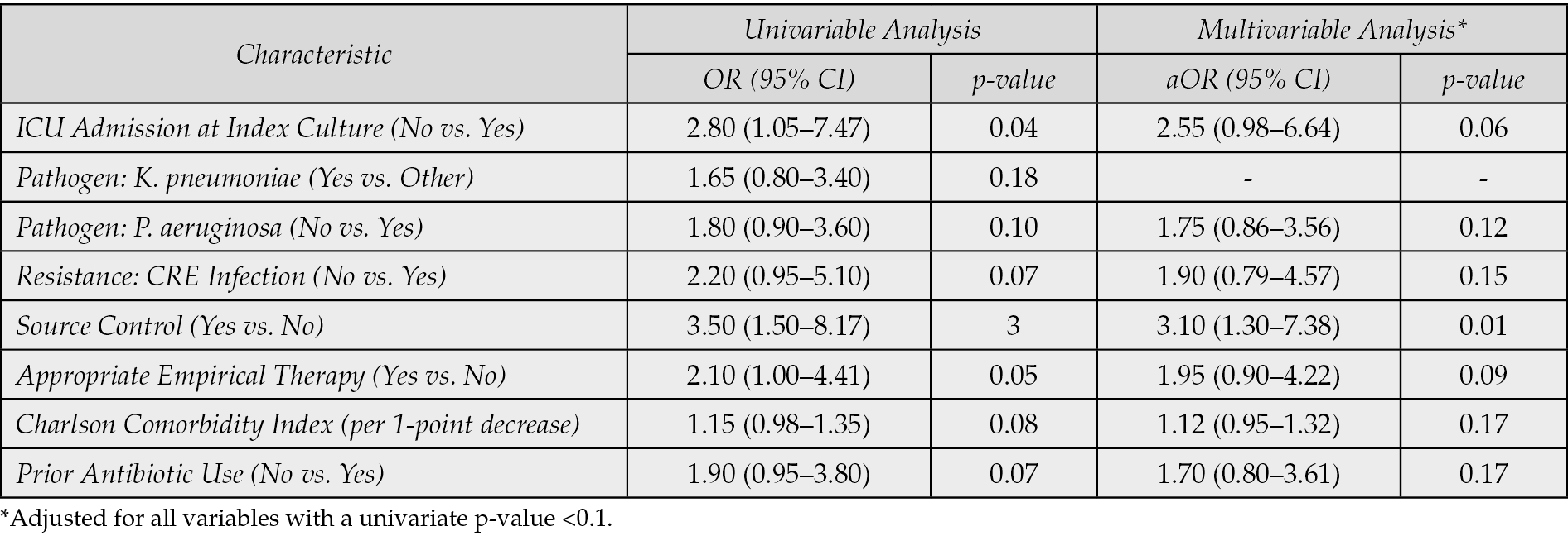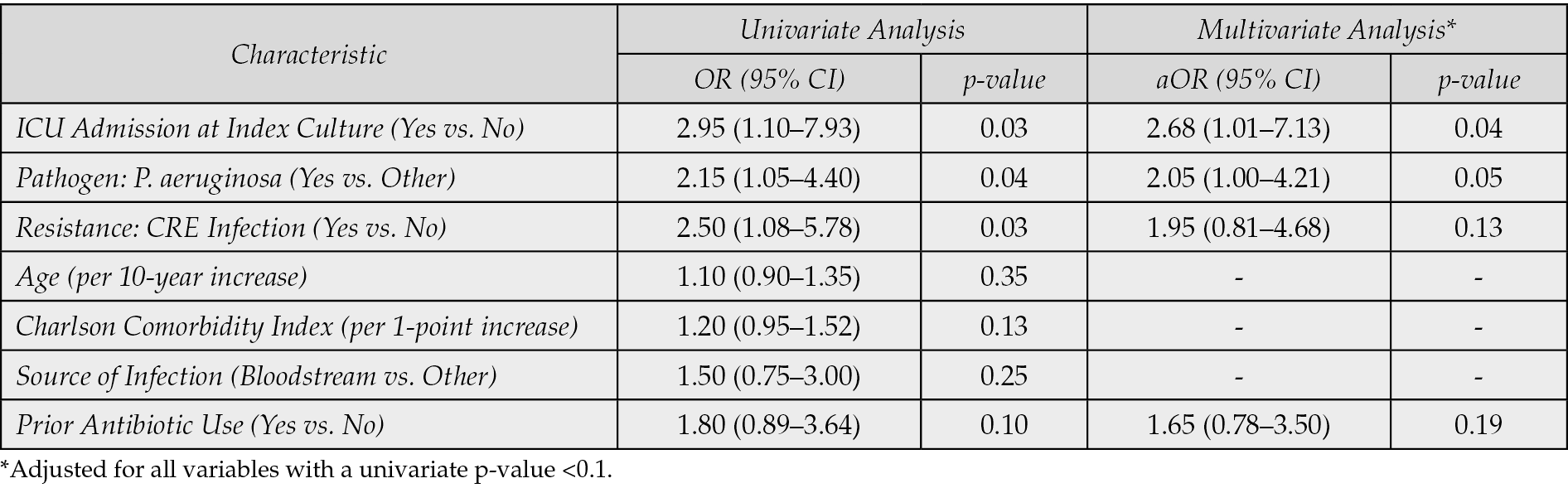In the univariable analysis, several factors were found to be significantly associated with increased 30-day all-cause mortality (Table 7). These included ICU admission (Odds Ratio [OR]: 2.95; 95% Confidence Interval [CI]: 1.10–7.93; p=0.03), infection caused by Pseudomonas aeruginosa (OR: 2.15; 95% CI: 1.05–4.40; p=0.04), and the presence of a CRE infection (OR: 2.50; 95% CI: 1.08–5.78; p=0.03). Factors such as age, gender, and type of infection source (e.g., bloodstream vs. respiratory) did not show a statistically significant association with mortality in the univariate analysis. Variables with a p-value less than 0.1 in the univariable analysis were considered for the multivariable model. After adjusting for confounding factors, ICU admission remained an independent predictor of 30-day all-cause mortality (Adjusted OR [aOR]: 2.68; 95% CI: 1.01–7.13; p=0.04). Similarly, infection with Pseudomonas aeruginosa also maintained its independent association with increased mortality (aOR: 2.05; 95% CI: 1.00–4.21; p=0.05). The association with CRE infection, while still indicating increased risk, did not reach statistical significance in the multivariate model after adjusting for other factors (aOR: 1.95; 95% CI: 0.81–4.68; p=0.13), suggesting its effect might be partially mediated by or correlated with other severe disease parameters often found in ICU settings.