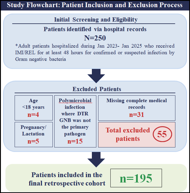 This was a retrospective, single-centre, observational study conducted at Second University Department of Internal Medicine and Department of Infectious Diseases of University General Hospital of Alexandroupolis (Greece). The study included adult patients who were hospitalized during the period from January 2023 to January 2025 and received IMI/REL for at least 48 hours for microbiologically confirmed Gram-negative bacteraemia due to difficult-to-treat (DTR) pathogens. While IMI/REL therapy may have been initiated empirically in some cases, inclusion in the final cohort was contingent upon subsequent positive blood culture confirmation of a DTR Gram-negative bacterium. Patients were excluded from the study if any of the following criteria were met: age less than 18 years, pregnancy or lactation, polymicrobial infection where a DTR Gram-negative bacterium was not considered the primary pathogen and patients for whom complete medical records or outcome data were unavailable for retrospective review. Informed consent was obtained from all subjects involved in the study, as this was a specific requirement of the Institutional Review Board for the retrospective analysis of patient medical records. The study was approved by the Ethics Committee of University General Hospital of Alexandroupolis and Democritus University of Thrace.