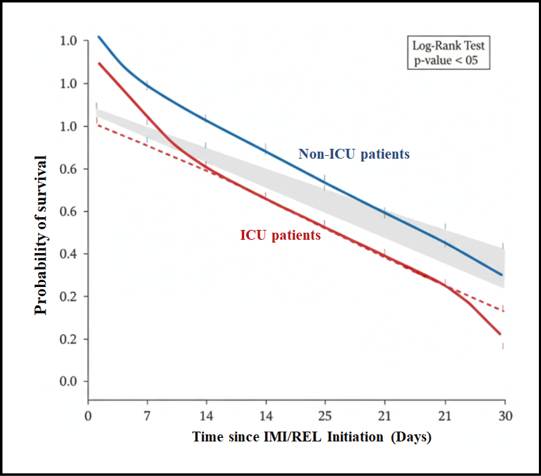 Note: The curve plots the probability of survival from the day of IMI/REL initiation up to 30 days. The blue line represents non-ICU patients (n=169), and the red line represents ICU patients (n=26) at the time of index culture. The grey shaded areas indicate the 95% confidence intervals.