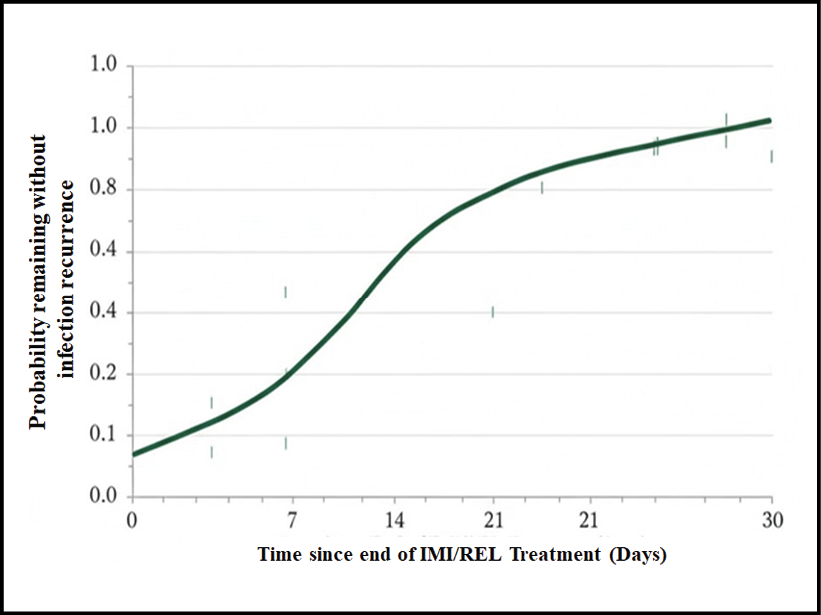 The curve plots the probability of remaining infection-free over 30 days following the end of IMI/REL therapy. Patients who died or were lost to follow-up within 30 days were censored.