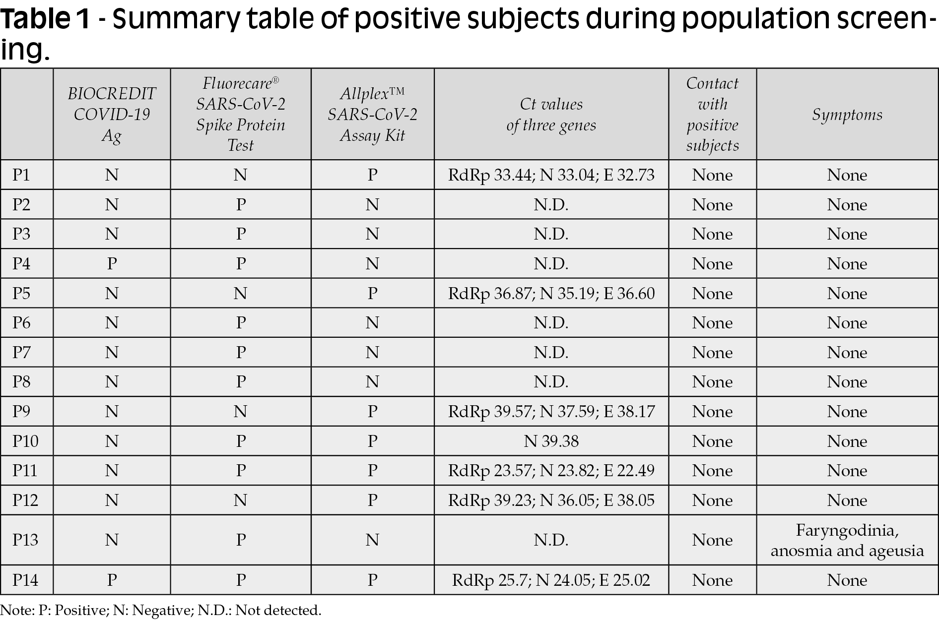 In January 2021, a total of 159 consecutive subjects were enrolled in one day. Subjects of all age groups who were asymptomatic or pauci-symptomatic were included. Confirmed COVID-19 cases by gold standard RT-PCR were excluded. The screened people provided demographic characteristics, symptoms and reason for testing. We carried out on each of the enrolled subjects three nasopharyngeal swabs. Two of these were immediately processed using RATs, while the remaining nasopharyngeal swab to be subsequently analyzed by RT-PCR were placed in Universal Transport Medium® for viruses (UTM) and stored at - 80°C.